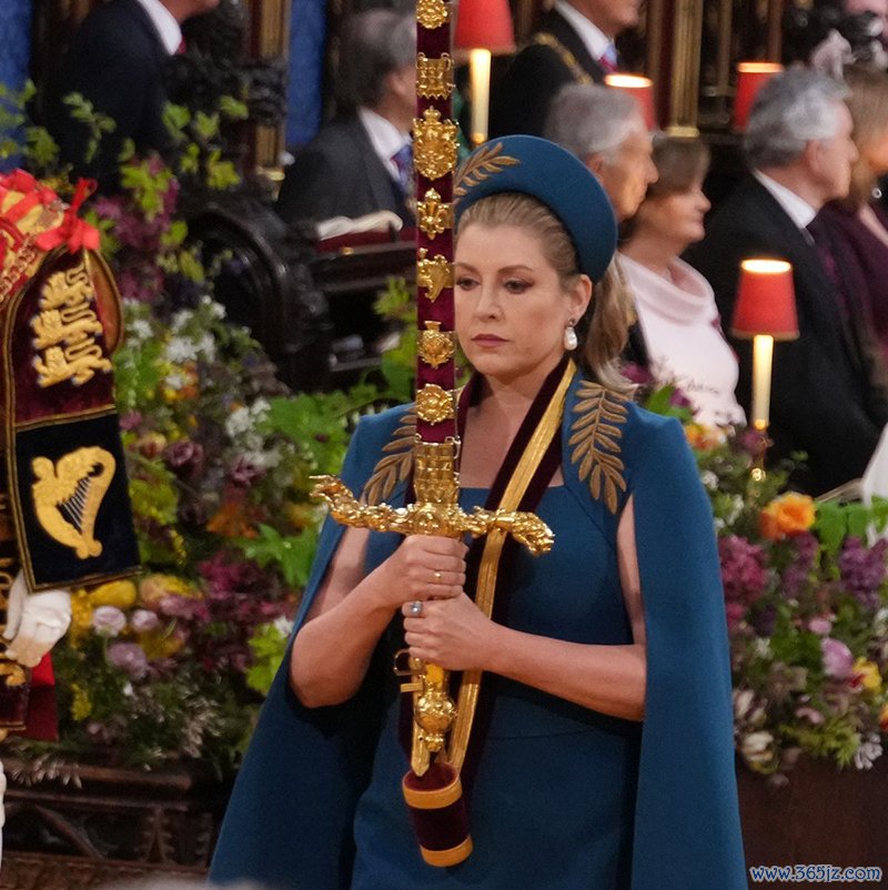 现任下议院领袖兼枢密院议长彭妮·莫当特(Penny Mordaunt),手持“献纳之宝剑”(The Jewelled Sword of Offering)于队伍前方引领查尔斯三世进入威斯敏斯特教堂。之后,她以枢密院议长的身份将宝剑授予国王。