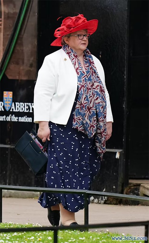 根据传统,枢密院议长在加冕礼上需要身穿黑色和金色的宫廷礼服,而身为第一位以此身份主持加冕礼的女性,莫当特选择了更现代又致敬传统的水鸭蓝色斗篷连衣裙和发带,连衣裙由伦敦品牌萨菲亚(Safiyaa)设计,发带由英国皇家女帽设计师简·泰勒(Jane Taylor)设计,二者均由英国刺绣品牌Hand & Lock绣上了代表枢密院的金色蕨草图案。