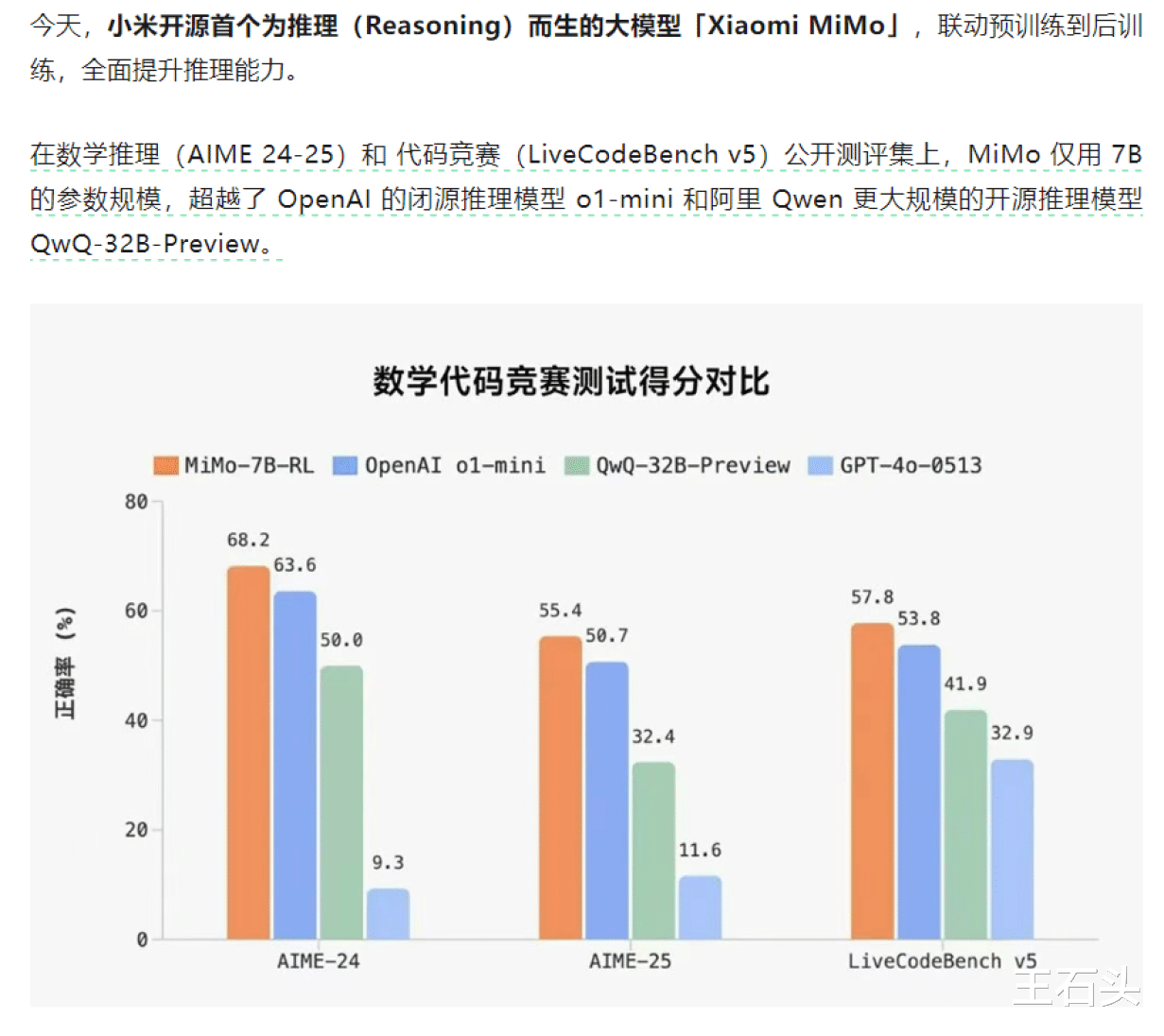4月底,小米开源首个推理专用大模型Xiaomi MiMo,仅7B参数却在数学推理(AIME 24-25)和代码生成(LiveCodeBench v5)任务中超越OpenAI的o1-mini和阿里Qwen-32B。